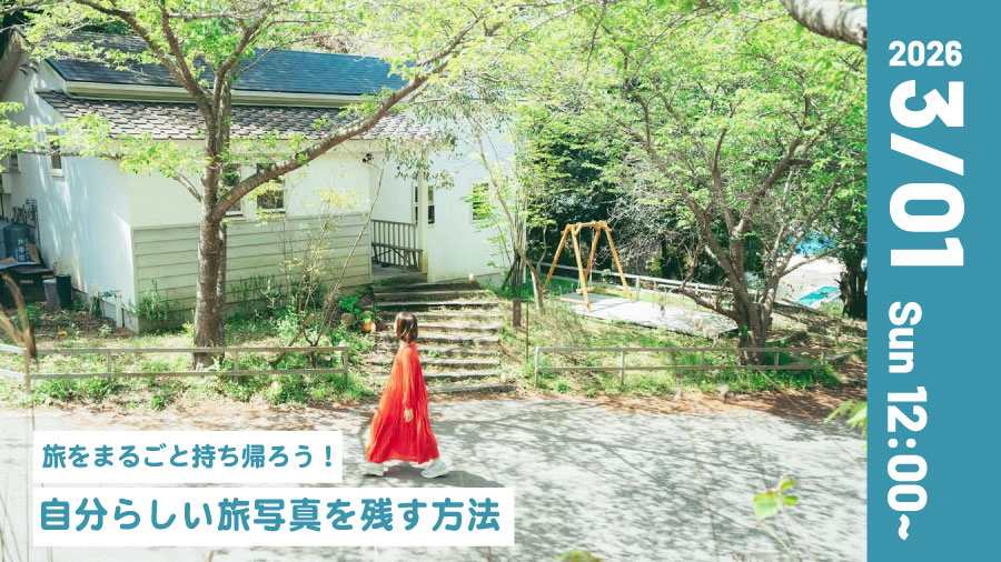| 内容 | 「もっと自分らしい写真を撮りたい!」「特別な旅の思い出を残したい!」 そんな方に向けた、気軽に楽しめるワークショップです。自分らしい表現を見つけるためのヒントをお届け。写真の撮り方だけでなく、SNSでの見せ方や発信方法も、思わず試したくなる視点でわかりやすく解説します。すぐに試せるコツで、旅がもっと楽しくなるはず! |