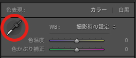 写真を撮っていると色味のついた照明の影響を受けて白が本来の白色に見えなかったりします。(オレンジがかっていたり青みがかっていたり)ホワイトバランスとはその名の通り、白を白く表示するための機能です。Lightroomでいうと下の写真のこの部分です。
