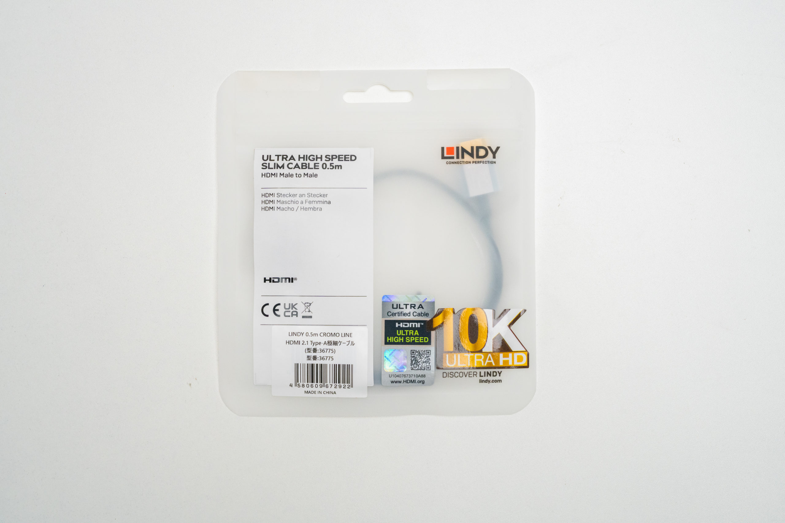 「LINDY 0.5m CROMO LINE HDMI 2.1 Type-A」はこのように梱包された状態で届きます。