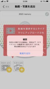ひとつめは、DVDに収録できる動画は20本以下(スライドショーは動画1本と数えます)または、再生時間が30分以下のものになるということです。