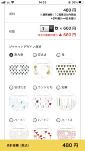 金額の確認画面が出てくるので、送料がかかることを確認し下にスクロールしていきます。ここでデザインの選択が出てくるので、デザインを選択。なんとなく「ハート1」にしてみました。季節限定のデザインも出ているようで、この時期は「節分」をイメージしたものがありました。