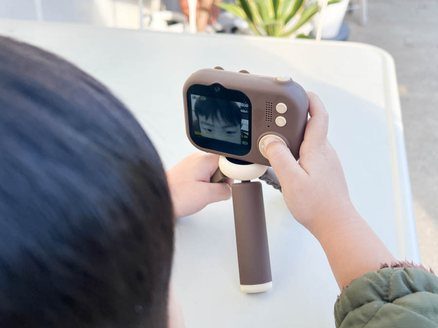 2歳ごろにも一度キッズカメラを購入したことがあるのですが、そのときは自撮りレンズが無かったので、MOARSのキッズカメラで自撮りをすることがすごく楽しんでいます!また、三脚をつけて机に置くと、ちょうど子供の目線の高さに合うので撮影しやすいみたいです。