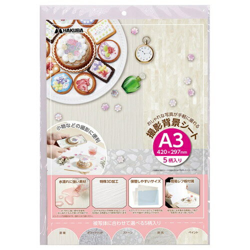 ハクバの撮影背景シートは、漆喰、ホワイトウッド、ストーン、斜光、ペイントの5種類のデザインがセットになっています。すべて女性らしい優しい雰囲気の背景なので、お菓子やコスメ、アクセサリーなどの撮影にも向いています。